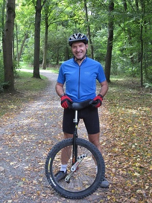 Am 7. September 2014 im Landschaftsgarten Schönbusch startet Luigi mit einem 24 Zoll-Einrad den VersuchEin Mann, ein Einrad, ein QU-AX 24 Zoll Cross mit 3 Zoll-Bereifung